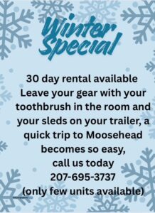 Amazing fishing, camping, hunting and exploring in the area. Go to historic sites like the B-52 crash site, ride the Katahdin Steam Ship, or charter a scenic tour in the many float planes on the lake.